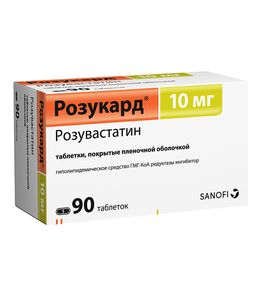 Показания к применениюПервичная гиперхолестеринемия (тип IIа по Фредриксону), включая гетерозиготную наследственную гиперхолестеринемию или смешанная (комбинированная) гиперхолестеринемия (типа IIЬ по Фредриксону), в качестве дополнения к диете и другим немедикаментозным мероприятиям (физическая нагрузка и снижение массы тела) при неэффективности диетотерапии и немедикаментозных мероприятий;Гомозиготная форма наследственной гиперхолестеринеми и при недостаточной эффективности диетотерапии и других видов лечения, направленных на снижение уровня липидов (например, аферез ЛПНП), или если такие виды лечения не подходят пациенту.Гипертриглицеридемия (тип IV по Фредриксону) в качестве дополнения к диете.Для замедления прогрессирования атеросклероза в качестве дополнения к диете у пациентов, которым показана терапия для снижения концентрации общего ХС и ХС — ЛПНП.Профилактика основных сердечно-сосудистых осложнений (инсульта, инфаркта, артериальной реваскуляризации) у взрослых пациентов без клинических признаков ишемической болезни сердца (ИБС), но с повышенным риском ее развития (возраст старше 50 лет для мужчин и старше 60 лет для женщин, повышенная концентрация С-реактивного белка (≥ 2 мг/л) при наличии, как минимум одного из дополнительных факторов риска, таких как артериальная гипертензия, низкая концентрация ХС-ЛПВП, курение, семейный анамнез раннего начала ИБС).Применение при беременности и кормлении грудьюРозукард противопоказан при беременности и в период лактации (грудного вскармливания).Применение препарата Розукард у женщин репродуктивного возраста возможно только в случае применения надежных методов контрацепции и если пациентка информирована о возможном риске лечения для плода.Поскольку холестерин и вещества, синтезируемые из холестерина важны для развития плода, потенциальный риск ингибирования ГМГ-КоА-редуктазы превышает пользу от применения препарата во время беременности. В случае диагностирования беременности в процессе терапии препаратом прием препарата Розукард следует немедленно прекратить, а пациентка должна быть предупреждена о потенциальном риске для плода.При необходимости применения препарата в период лактации, учитывая возможность нежелательных явлений у грудных детей, следует решить вопрос о прекращении грудного вскармливания.СоставДействующее вещество: Розувастатин (Rosuvastatin)Концентрация действующего вещества (мг): 10