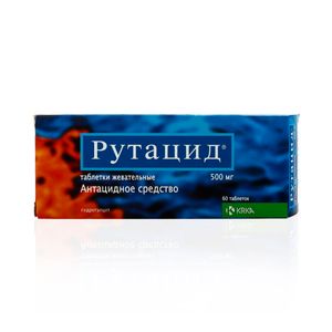 Показания к применениюОстрый гастрит. Хронический гастрит с повышенной секреторной функцией в фазе обострения. Острый и хронический дуоденит. Язвенная болезнь желудка и двенадцатиперстной кишки. Рефлюкс-эзофагит. Дискомфорт и боли в эпигастрии, изжога, кислая отрыжка после погрешностей в диете, избыточного употребления алкоголя, приема лекарственных средств.Применение при беременности и кормлении грудьюПодтвержденных данных о нежелательном действии гидроталцита в период беременности и грудного вскармливания нет. Применение препарата Рутацид во время беременности разрешен в случае, если потенциальная польза для матери превышает возможный риск для плода. Препарат Рутацид не проникает в грудное молоко, поэтому его применение возможно в период грудного вскармливания.ПротивопоказанияПочечная недостаточность. Повышенная чувствительность к гидроталциту и другим компонентам препарата.Побочное действиеСо стороны пищеварительной системы при приеме препарата в высоких дозах возможна диарея.Состав1 таблетка жевательная содержит: гидроталцит 500 мг. Вспомогательные вещества: маннитол, натрия сахарин, мята колосковая, натрия крахмалагликолат, тальк, магния стеарат.Взаимодействие с другими препаратамиКак и другие антациды, Рутацид может уменьшать всасывание тетрациклинов, хинолонов (ципрофлоксацина, офлоксацина), препаратов железа и кумаринов, антибиотиков.