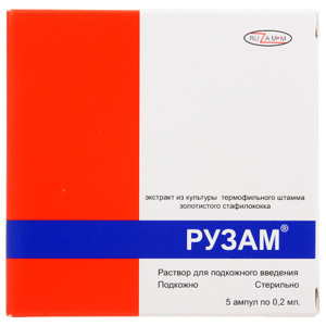 Показания к применению Сезонный (поллинозы) и круглогодичные аллергические риниты, бронхиальная астма, крапивница и отек Квинке, атопический и другие аллергические дерматиты, частые респираторные инфекции.Применение при беременности и кормлении грудьюПротивопоказан при беременности и в период грудного вскармливания.Противопоказания Повышенная чувствительность к препарату, беременность и период грудного вскармливания, детский возраст до 4 лет, острая инфекция, туберкулез в активной форме, декомпенсированные заболевания внутренних органов.Побочное действие Повышение температуры тела до субфебрильных цифр, слабость, обострение хронического очага инфекции, кратковременное усиление кашля при хроническом бронхите, усиление высыпаний на коже при кожной аллергии.Эти симптомы, как правило, слабо выражены и преходящи, не требуют отмены препарата.СоставДействующее вещество: экстракт из культуры термофильного штамма золотистого стафилококка (Staphylococcus aureus, штамм С -2) — 0,2 мл.Вспомогательные вещества: раствор натрия хлорида для инъекций 0,9%, фенол 0,025 &mdash, 0,5%.Взаимодействие с другими препаратамиВзаимодействия препарата Рузам ,с другими лекарственными средствами не зарегистрировано. Рузам ,может быть назначен вместе с антигистаминными, глюкокортикостероидными препаратами или антибиотиками.