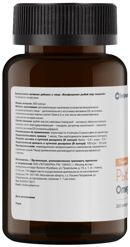 Рыбий жир Биафишенол пищевой, 350 мг, 360 шт, капсулы