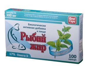 Капсулы рыбий жир РеалКапс с мелиссой — источник омега-3 полиненасыщенных жирных кислот. Также, рыбий жир может содержать витамины А и D, натуральные или искусственно добавленные. Содержание омега-3 и витаминов в рыбьем жире непостоянно, поэтому всегда обращайте внимание на содержание этих компонентов в том рыбьем жире, который Вы приобретаете. Важно и то, что рыбий жир в жидком виде очень быстро портится (окисляется под воздействием кислорода воздуха и температуры), поэтому более безопасно принимать капсулированный рыбий жир. Мелисса рекомендуется при мигрени и бессоннице, применяется как спазмолитическое, обезболивающее средство при метеоризме.