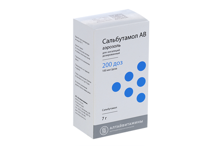 Главная » Аптека Сальбутамол АВ 100 мкг/доза, 200 доз, аэрозоль для ингаляций дозированный Просмотров 5 Алтайвитамины ЗАО