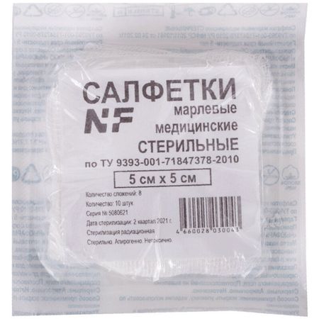Салфетки марлевые медицинские стерильные изготавливаются из высококачественной отбеленной хлопчатобумажной медицинской марли (100%). Стерилизация проводится радиационным методом. Главное отличие марлевых салфеток европейского качества: для изготовления используется специальное оборудование, позволяющее в процессе производства автоматическим способом надежно подворачивать края марли внутрь салфетки так, что при однократном развертывании исключается возможность попадания свободных нитей в рану. Типоразмер: 5 см х 5 см (в сложенном виде) Количество сложений: 8 сложений Состав: 100% хлопок Плотность марли: 36 г/м2 Стерильность: стерильные Количество в упаковке: 10 шт Тип упаковки: блистер Преимущества блистерной упаковки: — Наглядность. Прозрачная пленка позволяет изучить товар и визуально оценить его преимущества и качество; — Прочность. Блистерная упаковка не может расклеиться или деформироваться, обеспечивая надежную защиту продукта при транспортировке и хранении. Срок годности: 5 лет Назначение салфеток: Стерильные салфетки используют на открытых ранах, чтобы защитить их от негативного воздействия окружающей среды. Они легко снимаются и не прилипают к ране. Если использовать марлевые салфетки при ранениях, то срок заживления раны сократится в несколько раз. В хирургии для заживления послеоперационных швов. Также марлевые салфетки используют при ожогах различной степени, в том числе и химических; при ушибах; в косметологии — с целью снятия воспаления на коже после химических процедур.