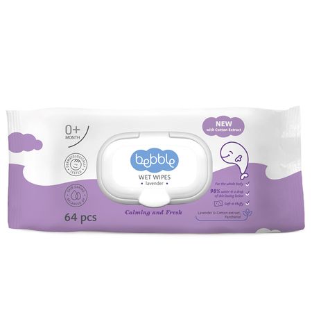 Салфетки Bebble влажные Лаванда 0+ с клипом-крышкой, 64 шт