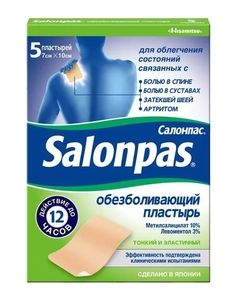 Пластырь "Салонпас" (Salonpas) применяется для облегчения острых и хронических болей, а также воспалительных реакций, связанных с мышечным утомлением, мышечной болью, малоподвижностью плечевого сустава, болью в спине, ушибами, растяжениями, вывихами, артритом, переломами, незначительным обморожением.Средство применяется для облегчения острых и хронических болей, а также воспалительных реакций, связанных с: мышечным утомлением, мышечной болью, малоподвижностью плечевого сустава, болью в спине, ушибами, растяжениями, вывихами, артритом, переломами, незначительным обморожением.