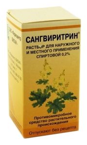 Показания к применениюДля профилактики: гнойно-воспалительных заболеваний кожи у новорожденных; раневой инфекции у хирургических больных.Для лечения: инфекционно-воспалительных заболеваний кожи бактериальной и грибковой этиологии (в т.ч. Candida albicans); в стоматологии: при пародонтите, афтозном стоматите, язвенно-некротическом гингивостоматите и других поражениях полости рта; в оториноларингологии: при заболеваниях среднего уха и наружного слухового прохода; в хирургии: при инфицированных ожогах, длительно незаживающих ранах и язвах; в гинекологии: при эндоцервиците, кольпите, вагините, эрозии шейки матки; в дерматологии: при пиодермиях, поверхностных бластомикозах, дерматомикозаПротивопоказания Грибковые поражения кожи и слизистых оболочек с явлениями экземы. Заболевания печени, сопровождающиеся нарушениями функции. Заболевания почек, сопровождающиеся нарушениями функции. Повышенная чувствительность к компонентам препарата.Побочное действиеАллергические реакции: местные проявления (гиперемия кожи).При полоскании и смазывании водным раствором препарата слизистых оболочек полости рта: ощущение горечи во рту.При применении Сангвиритрина на раневую поверхность: кратковременное ощущение жжения (в этих случаях препарат применяют в более низких концентрациях).СоставДействующие вещества:сангвиритрин 2 мг.Вспомогательные вещества:этанол 95%,вода очищенная.Взаимодействие с другими препаратамиВозможно одновременное применение Сангвиритрина со средствами для местной анестезии.