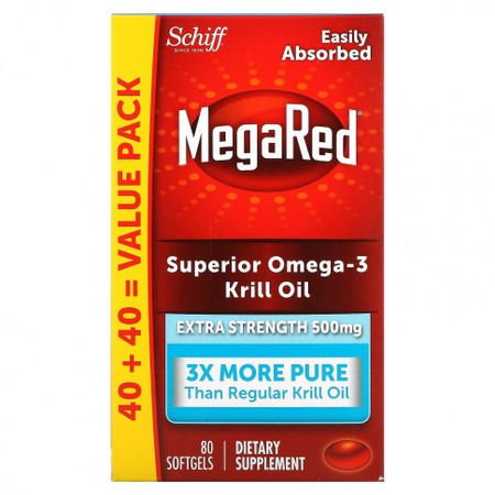 ‡ At time of manufacture. Компания основана в 1936 годуЛегко усваивается40 + 40 = экономичная упаковкаПовышенная сила действия — 500 мг В три раза чище, чем обычное масло криляПищевая добавкаДля здоровья, гигиены и домаДобыча морепродуктов экологичным способом сертифицирована Морским попечительским советом (MSC)Superba®Превосходное масло криля с омега-3 жирными кислотами MegaRed® ЧистотаМасло криля MegaRed® с PureTech™ в 3 раза чище обычного масла криля. Мы удаляем соли и другие примеси, чтобы получить самое чистое масло криля на рынке. Почувствуйте разницу — мягкая таблетка более светлая и прозрачная.Улучшенное усвоениеМасло криля с омега-3 от MegaRed® отличается от обычного масла криля. Оно содержит омега-3 кислоты в форме фосфолипидов, которые входят в состав клеточных мембран в вашем организме. Поэтому организм быстро распознает и легко усваивает MegaRed. Всего одна маленькая мягкая таблетка MegaRed†† содержит уникальную комбинацию омега-3 жирных кислот и действенного антиоксиданта астаксантина для поддержания вашего здоровья.Без рыбного послевкусияMegaRed легко усваивается в желудке, поэтому не оставляет неприятного послевкусия, которое свойственно рыбьему жиру.Масло криля с омега-3 MegaRed — лучший выбор