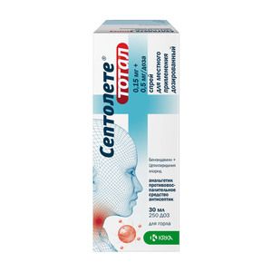 Показания к применениюСимптоматическая терапия болевого синдрома воспалительных заболеваний полости рта и ЛОР-органов (различной этиологии), в том числе тонзиллитов, фарингитов, в составе комплексной терапии.Применение при беременности и кормлении грудьюПрименение препарата Септолете® тотал противопоказано при беременности и в период грудного вскармливания. При необходимости применения препарата в период лактации грудное вскармливание следует прекратить.Противопоказания овышенная чувствительность к действующим веществам, либо к любым вспомогательным компонентам препарата. Детский возраст до 6 лет. Беременность, период грудного вскармливания.Повышенная чувствительность к ацетилсалициловой кислоте или другим нестероидным противовоспалительным препаратам, бронхиальная астма (в т. ч. в анамнезе), заболевания печени, алкоголизм, черепно-мозговая травма, заболевания головного мозга.Побочное действиеКлассификация частоты развития побочных эффектов, рекомендуемая Всемирной организацией здравоохранения (ВОЗ):очень часто ≥ 1/10часто от ≥ 1/100 до < 1/10нечасто от ≥ 1/1000 до < 1/100редко от ≥ 1/10000 до < 1/1000очень редко < 1/10000частота неизвестна не может быть оценена на основе имеющихся данных.Нарушения со стороны иммунной системы:частота неизвестна: реакции повышенной чувствительности, анафилактические реакции.Нарушения со стороны нервной системы:частота неизвестна: онемение слизистой оболочки полости рта.Нарушения со стороны дыхательной системы, органов грудной клетки и средостения:редко: бронхоспазм.Нарушения со стороны желудочно-кишечного тракта:очень редко: раздражение слизистой оболочки полости рта, чувство жжения в полости рта.Нарушения со стороны кожи и подкожных тканей:редко: крапивница, фоточувствительность;частота неизвестна: ангионевротический отек, кожный зуд.Если любые из указанных в инструкции побочных эффектов усугубляются, или Вы заметили любые другие побочные эффекты, не указанные в инструкции, сообщите об этом врачу.Взаимодействие с другими препаратамиНе описано. Следует избегать одновременного применения с другими препаратами из группы антисептиков.