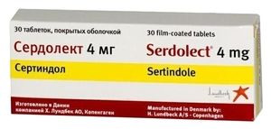 Показания к применениюШизофрения (за исключением острых психотических расстройств), при непереносимости как минимум одного антипсихотического средства.Применение при беременности и кормлении грудьюПротивопоказан при беременности, в период лактации.ПротивопоказанияГипокалиемия, гипомагниемия; тяжелые сердечно-сосудистые заболевания (в т.ч. в анамнезе), включая застойную сердечную недостаточность, гипертрофию миокарда, аритмию или брадикардию (менее 50 уд./мин), врожденный синдром удлиненного интервала QT или наличие этого синдрома у родственников больного, приобретенный удлиненный интервал QT (более 450 мсек у мужчин и 470 мсек у женщин); одновременный прием препаратов, удлиняющих интервал QT (в т.ч. антиаритмиков классов I A и III, некоторых антипсихотических средств, антибиотиков группы макролидов, фторхинолонов, антигистаминных средств, цизаприда, препаратов лития); одновременный прием препаратов, ингибирующих изоферменты CYP3A (в т.ч. противогрибковых средств производных азола, антибиотиков группы макролидов, ингибиторов ВИЧ-протеазы, циметидина); тяжелая печеночная недостаточность; угнетение функции ЦНС различной этиологии; беременность, период лактации; детский и подростковый возраст до 18 лет; повышенная чувствительность к сертиндолу.Побочное действиеСо стороны дыхательной системы: часто — ринит, затруднение носового дыхания; редко — одышка.;Со стороны ЦНС и периферической нервной системы: редко — головокружение, парестезии, синкопальные состояния, судорожные расстройства, двигательные нарушения (включая позднюю дискинезию), злокачественный нейролептический синдром.;Со стороны пищеварительной системы: редко — сухость во рту.;Со стороны сердечно-сосудистой системы: редко — постуральная гипотензия, увеличение интервала QT, пароксизмы желудочковой аритмии (типа «пируэт»).;Со стороны мочевыделительной системы: редко — лейкоцитурия, гематурия.;Со стороны обмена веществ: редко — увеличение массы тела, гипергликемия.;Прочие: периферические отеки, уменьшение объема эякулята.СоставСертиндол 4 мг;Вспомогательные вещества: крахмал кукурузный, лактозы моногидрат, целлюлоза микрокристаллическая, гипролоза, магния стеарат, натрия кроскармеллоза.;Состав оболочки: гипромеллоза, макрогол 400, титана диоксид (Е171), железа оксид желтый (Е172).