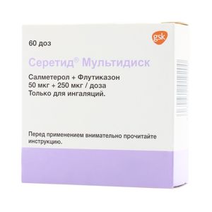 Показания к применениюПрепарат Серетид Мультидиск предназначен для регулярного лечения бронхиальной астмы, если показана комбинированная терапия бета2-адреномиметиком длительного действия и ингаляционным кортикостероидом: пациентам с недостаточным контролем заболевания на фоне постоянной монотерапии ингаляционными кортикостероидами при периодическом использовании бета2- адреномиметика короткого действия, или пациентам с адекватным контролем заболевания на фоне терапии ингаляционным кортикостероидом и бета2-адреномиметиком длительного действия, или в качестве стартовой поддерживающей терапии у пациентов с персистирующей бронхиальной астмой при наличии показаний к назначению глюкокортикостероидов для достижения контроля над заболеванием.Препарат Серетид Мультидиск предназначен для поддерживающей терапии у пациентов при ХОБЛ со значением объема форсированного выдоха (ОФВ1) меньше 60% от должных величин (до ингаляции бронходилататора) и повторными обострениями в анамнезе, у которых выраженные симптомы заболевания сохраняются, несмотря на регулярную терапию бронходилататорами.Применение при беременности и кормлении грудьюФертильностьОтсутствуют данные по влиянию на фертильность у человека. В исследованиях на животных не было выявлено влияния флутиказона пропионата или салметерола ксинафоата на фертильность самцов или самок.БеременностьДанные о применении препарата у беременных женщин ограничены. Применение во время беременности допустимо только в случае, если потенциальная польза для матери превышает возможный риск для плода.Согласно результатам ретроспективного исследования, не выявлено повышенного риска возникновения серьезных врожденных пороков развития (СВПР) после воздействия флутиказона пропионата на протяжении I триместра беременности по сравнению с другими ингаляционными кортикостеродами.При проведении исследований репродуктивной токсичности у животных с введением как каждого компонента препарата в отдельности, так и их комбинации, было выявлено влияние на плод избыточных системных концентраций активного бета2-адреномиметика и ГКС.Обширный опыт клинического применения препаратов данного класса свидетельствует, что при использовании терапевтических доз описанные эффекты не являются клинически значимыми.Период грудного вскармливанияКонцентрация салметерола и флутиказона пропионата в плазме крови после вдыхания препарата в терапевтических дозах крайне низка, поэтому их концентрация в грудном молоке должна быть такой же низкой. Это подтверждается исследованиями на животных, в молоке которых определялись низкие концентрации препарата. Сопутствующих данных относительно грудного молока женщин нет.Применение препарата в период грудного вскармливания допустимо только в случае, если потенциальная польза для матери превышает возможный риск для ребенка.ПротивопоказанияПовышенная чувствительность к компонентам препарата; детский возраст до 4-х лет.