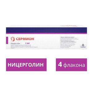 Показания к применению- острые и хронические церебральные метаболические и сосудистые нарушения (вследствие атеросклероза, артериальной гипертензии, тромбоза или эмболии сосудов головного мозга, в т. ч. острое транзиторное нарушение мозгового кровообращения, сосудистая деменция и головная боль, вызванная вазоспазмом); — острые и хронические периферические метаболические и сосудистые нарушения (органические и функциональные артериопатии конечностей, болезнь Рейно, синдромы, обусловленные нарушением периферического кровотока); — в качестве дополнительного средства при лечении гипертонического криза (парентерально).Применение при беременности и кормлении грудьюВ связи с отсутствием специальных исследований при беременности Сермион следует применять только по строгим показаниям и под непосредственным контролем врача.На время приема препарата необходимо отказаться от грудного вскармливания, т.к. ницерголин и продукты его метаболизма выделяются с грудным молоком.Противопоказания- недавно перенесенный острый инфаркт миокарда; — острое кровотечение; — выраженная брадикардия; — нарушение ортостатической регуляции; — повышенная чувствительность к ницерголину. С осторожностью следует применять при гиперурикемии или подагре в анамнезе и/или в сочетании с лекарственными средствами, которые нарушают метаболизм и/или выведение мочевой кислоты.Побочное действиеСо стороны сердечно-сосудистой системы: редко — выраженное снижение АД (в основном после парентерального введения), головокружение, ощущение жара. Со стороны нервной системы: редко — сонливость или бессонница. Со стороны обмена веществ: возможно повышение концентрации мочевой кислоты в крови, причем этот эффект не зависит от дозы и длительности терапии. Прочие: редко — диспептические явления, кожные высыпания. Побочные эффекты обычно легко или умеренно выражены.СоставДействующее вещество: НицерголинКонцентрация действующего вещества (мг): 4 мгВзаимодействие с другими препаратамиПри одновременном применении Сермион может усиливать действие антигипертензивных средств.Ницерголин метаболизируется под действием изофермента CYP2D6, поэтому нельзя исключить возможность взаимодействия Сермиона с препаратами, которые метаболизируются при участии этого же фермента.