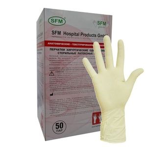 Бренд SFM Hospital Products GmbH, Германия — мировой лидер по разработке, усовершенствованию и производству медицинских изделий.Перчатки хирургические sfm латексные стерильные — для работ в медицинских, хирургических целях.Технические характеристики перчаток:Материал: 100% натуральный латекс.Назначение — хирургические.Анатомические — разделение на правую и левую руки.Манжета стандартная, с валиком.Покрытие: неопудренные, БЕЗ ПУДРЫ — снижает риск возникновения аллергических реакций и кожных раздражений.Стерильные — стерилизация — оксид этилена.Длина перчатки от кончика среднего пальца до валика 280 мм — 300 мм.Одинарная толщина пальца (13мм от кончика): 0.15 ± 0.02мм.Одинарная толщина ладони (центр): 0.13 ± 0.02мм.Одинарная толщина манжеты (25мм от валика): 0.11± 0.02мм.Отделка внешней поверхности: текстурированные, микрошероховатая поверхность по всей площади.Без адгезивной полосы.Внутреннее полимерное покрытие — специализированное внутреннее покрытие, для облегчения надевания перчатки.Коэффициент прочности — AQL — 1,0 (Испытание воздушным насосом).Герметичность: Стандарт G1.Стандарт: ASTM D3578-05 (2015).Вес перчаток: 8.5 ± 0.2гр.Наличие сертификата ISO 13485:2003, 9001:2000.Цвет изделия — натуральный.Срок годности 5 лет.Перчатки стерильные хирургические имеют повышенную длину, что отлично защищает предплечье, а валик предотвращает скатывание перчатки и надежно фиксирует рукав.Перчатки хирургические стерильные имеют текстуру по всей поверхности перчатки, что: обеспечивает надежный захват инструмента и безопасность манипуляций, текстура на тыльной стороне перчатки исключает бликование поверхности.Высокая чувствительность хирургической перчатки обеспечивается микротекстурированной поверхностью, что также облегчает захват.