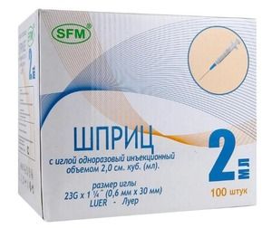 Бренд SFMШприц двухкомпонентный SFM Hospital Products GMBH объемом 5 мл — это медицинское изделие, которое используется для инъекций.Характеристики: Объем — 2 мл Двухкомпонентный Стерильный Одноразовый Имеет индивидуальную упаковку Выполнен из качественного и безопасного материала Игла съёмная, приложенная Размер иглы 23G (0,6×30 мм) Соединение шприца с иглой — тип Luer-слип Положение Луер-крепления (конуса цилиндра) шприца — коаксильное (расположено по центру цилиндра шприца) Прозрачный цилиндр облегчает контроль объема и прозрачности медикамента Градуировка четкая, контрастная, черного цвета, что способствует максимально точной дозировке Прочное двойное стопорное кольцо предотвращает случайное выдергивание поршня в момент набора лекарственного средства Индивидуальная стерильная блистерная упаковка с отогнутым краемШприцы двухкомпонентные SFM Hospital Products GMBH одноразовые стерильные применяют для выполнения подкожных, внутримышечных инъекций и других лечебно-диагностических мероприятий.Шприц изготовлен из специального полипропилена и состоит из двух частей: цилиндр и поршень, идет в комплекте с иглой.Безболезненность инъекции обуславливается легким скольжением поршня, без трения.Игла при введении не травмирует ткани, за счёт покрытия специальной смазкой.Индивидуальная стерильная блистерная упаковка с отогнутым краем — плотная мед.бумага и прозрачная пленка (состав пленки — полиэтилен).