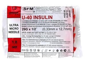 Бренд SFM Hospital Products GmbH (Германия)Шприц инъекционный инсулиновый SFM 1,0 мл, (шкала U-40) — применяют для инъекций инсулинаСтерильный. Стерильно, апирогенно, нетоксично, однократного применения.ОдноразовыйТрехкомпонентный с резиновой манжетой на поршне для обеспечения исключительной плавности введения препаратов (черная манжета так же позволяет контролировать забор лекарства до необходимого объема),Безболезненность инъекции обуславливается легким скольжением поршня, без трения.Игла 29G (нержавеющая сталь) — игла съёмная, надета на шприцИнъекционная игла имеет трёхгранную заточку острия, обеспечивающую легкий и комфортный прокол тканиСоединение шприца с иглой — тип LuerПоложение луер-крепления (конуса цилиндра) шприца — концентрическоеНестираемая градуировка (четкая, контрастная)- способствует максимально точной дозировке,Градуировка на шприце выполнена в единицах инсулина и позволяет легко считывать показания.Цветовая кодировка иглы, т.е. пластиковое основание иглы определенного диаметра должно иметь определенный цвет (коричневый)Удерживающее кольцо на поршне предотвращает потерю медикамента.Цилиндр полностью прозрачен обеспечивает отличную визуализацию содержимого шприца,Запрещается использовать шприцы и иглы повторно.Стерильность нарушается при снятии колпачка с иглы.Упаковка — блистер
