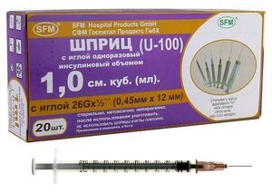 Бренд SFMШприц инсулиновый 1 Мл 40 МЕ 3-х компонентный с иглой 26G х 1/2 0,45ммХ12ммШприц инсулиновый трехкомпонентный SFM Hospital Products GMBH объемом 1 мл со шкалой 40 МЕ- это медицинское изделие, которое используется для инъекций инсулина.Выполнен из качественного и безопасного материала.Шкала U-40.Игла 26G (0,45 мм x 12 мм) — съёмная, надетая на шприц.Игла входит в ткань, не разрезая, а раздвигая волокна.Силиконовое покрытие делает ее продвижение плавным и безболезненным.Прозрачный цилиндр облегчает контроль объема и прозрачности медикамента.Манжета без латекса. Шприцы имеют высокую точность и позволяют контролировать дозу препарата.Индивидуальная упаковка обеспечивает сохранность стерильности.Шприцы инсулиновые трехкомпонентные — это надежный и удобный инструмент для проведения медицинских процедур в домашних условиях или в медицинских учреждениях.Характеристики: Объем 1 мл Шкала U-40Шаг шкалы — 1 единица (unit) Трехкомпонентный Манжета без латекса — LATEX FREE, из термопластичного эластомера Стерильный Одноразовый Имеет индивидуальную блистерную упаковку Выполнен из качественного и безопасного материала Соединение шприца с иглой — тип Luer-слип Игла съёмная, надета на шприц Размер иглы 26G х 1/2 0,45ммХ12мм Игла атравматическая с трехгранной заточкой и силиконовым покрытием (каждая грань трижды шлифуется ультразвуком игла трижды покрывается силиконом) Прозрачный цилиндр облегчает контроль объема и прозрачности медикамента Градуировка четкая, контрастная, черного цвета, что способствует максимально точной дозировке Прочное двойное стопорное кольцо предотвращает случайное выдергивание поршня в момент набора лекарственного средства Стерилизация газовым методом (Оксид этилена)Шприц инсулиноовый U40 трёхкомпонентный 1 млШкала U-40Игла 26G х 1/2 0,45ммХ12мм,Игла съёмная, надетая на шприц.Количество в упаковке — 20 шт.Острие иглы имеет трехгранную заточку каждая грань трижды шлифуется ультразвуком игла трижды покрывается силиконом.Игла входит в ткань, не разрезая, а раздвигая волокна. Силиконовое покрытие делает ее продвижение плавным и безболезненным.