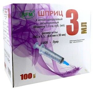 Шприц стерильный инъекционный однократного применения состоит из полого прозрачного цилиндра с нанесенной на него градуированной шкалой, наконечником (конусом) с отверстием и упорами для пальцев, штока-поршня с упором штока на нем и уплотнительным кольцом — манжетой (уплотнителем), надетой иглой инъекционной с защитным колпачком на ней.Соединение поршня с цилиндром и конусное соединение наконечника цилиндра с головкой инъекционной иглы водонепроницаемы, воздухонепроницаемы и герметичны под давлением.Шприц стерилизован оксидом этилена.Характеристики: СтерильныйОдноразовыйТрехкомпонентныйОбъем шприца 3 млШкала имеет градуировку до 3 млХарактеристика иглы:изготавливается из специальной особо прочной медицинской нержавеющей стали, трехгранная лазерная заточка иглы увеличивает проникающую способность иглы без дополнительных усилий (для быстрого безболезненного проникновения), смазка нанесена на наружную поверхность трубки иглы.Игла 23G (0,6 х 30 мм), надета на шприцПреимущества:Стопорное кольцо исключает случайное извлечение поршня из цилиндра и вытекание лекарства для внутримышечных инъекцийОбщая вместимость шприца несколько превышает номинальный объем (не менее, чем на 10 %)Прозрачный цилиндр облегчает контроль объема и прозрачности медикаментаИндивидуальная упаковка обеспечивает сохранность стерильности.Специальное покрытие (смазка) способствует легкому и плавному введению иглы. Смазка нанесена на внутреннюю поверхность шприца, включая поршень, и наружную поверхность трубки иглы, не заметна в виде капель при наблюдении нормальным или скорректированным до нормального зрением.