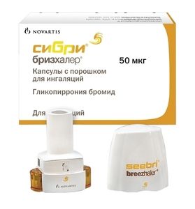 Показания к применению— поддерживающая терапия нарушений бронхиальной проводимости у пациентов с хронической обструктивной болезнью легких.Применение при беременности и кормлении грудьюВ доклинических исследованиях было показано отсутствие у препарата тератогенного эффекта после ингаляционного применения. В связи с отсутствием клинических данных по применению препарата Сибри; Бризхалер; у беременных женщин, препарат может применяться во время беременности только, если предполагаемая польза применения для пациентки превышает потенциальный риск для плода.Неизвестно, проникает ли гликопиррония бромид в грудное молоко у человека. Применение препарата Сибри; Бризхалер; при грудном вскармливании должно рассматриваться только, если польза для матери превышает любой потенциальный риск для младенца.Ни исследования репродуктивной токсичности, ни другие исследования на животных не дают оснований полагать, что препарат может влиять на фертильность у мужчин или женщин.Противопоказания— повышенная чувствительность к гликопиррония бромиду или любым другим компонентам, входящим в состав препарата;— возраст до 18 лет;— одновременный прием с ингаляционными лекарственными средствами, содержащими другие м-холиноблокаторы;— непереносимость галактозы, дефицит лактазы или глюкозо-галактозная мальабсорбция (препарат содержит лактозу).С осторожностью: закрытоугольная глаукома, заболевания, сопровождающиеся задержкой мочи, почечная недостаточность тяжелой степени (СКФ ниже 30 мл/мин/1.73 м2), включая терминальную стадию почечной недостаточности, требующую проведения гемодиализа (препарат Сибри; Бризхалер; следует применять только в случае, если ожидаемая польза превышает потенциальный риск); нестабильная ИБС, инфаркт миокарда в анамнезе, нарушения сердечного ритма, удлинение интервала QTc (QT скорректированный больше 0.44 с).СоставГликопиррония бромид 63 мкг,что соответствует содержанию гликопиррония основания 50 мкгВспомогательные вещества: лактозы моногидрат — 24.9 мг, магния стеарат — 0.037 мг.Состав капсулы: гипромеллоза — 45.59 мг, вода — 2.7 мг, каррагинан — 0.42 мг, натрия хлорид — 0.18 мг, краситель солнечный закат желтый (Е110) — 0.12 мг.