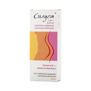 Показания к применениюПероральная контрацепция;— лечение легкой и умеренной угревой сыпи (акне) при неэффективности местного лечения у женщин, нуждающихся в контрацепции.Применение при беременности и кормлении грудьюСилует; противопоказан при беременности.Если в период приема препарата Силует; наступает беременность, то применение препарата должно быть незамедлительно прекращено. Имеющаяся информация относительно применения препарата Силует; при беременности слишком ограничена, чтобы делать выводы об отрицательных эффектах препарата Силует; на беременность, здоровье плода и новорожденного. Проведенные обширные эпидемиологические исследования не выявили повышенного риска дефектов развития у детей, рожденных женщинами, принимавшими половые гормоны с целью контрацепции до беременности или по неосторожности в ранние сроки беременности.Препарат Силует; противопоказан к применению у кормящих грудью женщин.СоставВ 1 таблетке: этинилэстрадиол 30 мкг; диеногест 2 мг.Вспомогательные вещества: лактозы моногидрат — 47.66 мг, крахмал кукурузный — 10.46 мг, гипромеллоза 2910 — 0.65 мг, тальк — 1.6 мг, полакрилин калия — 1.3 мг, магния стеарат — 1.3 мг.