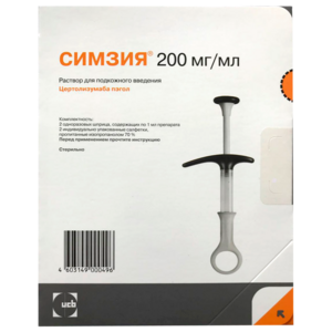 Главная » Аптека Симзия Раствор 200 мг/мл шприц 1 мл 2 шт Просмотров 10 Раствор для подкожного введения. Прозрачная или опалесцирующая бесцветная или желтого цвета жидкость ЮСБ Фарма
