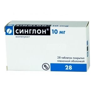 Показания к применению Длительное лечение и профилактика бронхиальной астмы (в т.ч. предупреждение дневных и ночных симптомов заболевания); лечение «аспириновой» астмы и профилактика бронхоспазма физического усилия.Применение при беременности и кормлении грудьюПрепарат Синглон может применяться при беременности и в период кормления грудью, если ожидаемая польза для матери превышает потенциальный риск для плода и ребенка.Противопоказания Гиперчувствительность к активному веществу или к любому из вспомогательных веществ; детский возраст до 15 лет; непереносимость лактозы, дефицит лактазы, глюкозо-галактозная мальабсорбция. С осторожностью: беременность и период лактации.Побочное действиеНарушения со стороны крови и лимфатической системы: повышенная склонность к кровотечениям. Нарушения со стороны иммунной системы: реакции гиперчувствительности, включая анафилаксию; эозинофильные инфильтраты печени. Нарушения психики: нарушения сна, включая ночные кошмары, галлюцинации, бессонницу; раздражительность, беспокойство, возбуждение, включая агрессивное поведение, тремор, депрессия, суицидальные мысли и суицидальное поведение (суицидальность). Нарушения со стороны нервной системы: головная боль, головокружение, сонливость, парестезия/гипестезия, судорожные припадки. Нарушения со стороны сердца: учащенное сердцебиение. Нарушения со стороны ЖКТ: боли в животе, диарея, сухость во рту, диспепсия, тошнота, рвота. Нарушения со стороны гепатобилиарной системы: повышение активности трансаминаз в сыворотке крови (аланинаминотрансферазы, аспартатаминотрансферазы), холестатический гепатит.Нарушения со стороны кожи и подкожных тканей: ангионевротический отек, появление экхимозов, крапивница, зуд, сыпь, узелковая эритема. Нарушения со стороны костно-мышечной системы и соединительной ткани: артралгия, миалгия, включая спазмы мышц.СоставДействующее вещество: Монтелукаст (montelukast) Концентрация действующего вещества (мг): 10
