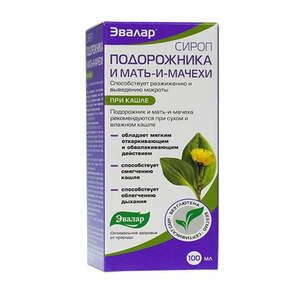 При появлении кашля важно правильно и своевременно подобрать вспомогательные противокашлевые средства. Подорожник и мать-и-мачеха – идеальное средство для разжижжения и выведения мокроты.»Сироп подорожника и мать-и-мачеха» от компании Эвалар – это растительный препарат, который обладает мягким отхаркивающим действием и способствует:смягчению кашля,облегчению дыхания,разжижению и выведению мокроты (в том числе трудноотделяемой мокроты),уменьшению частоты приступов кашля.В состав сиропа также входит витамин С, который повышает сопротивляемость организма к простудным заболеваниям, стимулирует иммунную систему, и эфирное масло мяты перечной для улучшения отделения мокроты. Рекомендуется как при сухом, так и при влажном кашле.