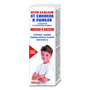 Линия Скорая помощь — линия средств при различных повреждениях кожиВнешний вид и свойства: консистенция густая, цвет прозрачный желтый, нейтральный запах»Скорая помощь» крем-бальзам от синяков и ушибовВходящие в бальзам лекарственные растения и экстракты традиционно используются при ушибах в медицине многих народов, а шалфей за его целебную силу даже считался священным растением.Активные компоненты:Бадяга — высокоэффективное средство для быстрого заживления ушибов, кровоподтёков, гематом, снижения боли. Трансдермальные (проводящие) свойства бадяги значительно усиливают активность натуральных компонентов крема-бальзама.Пиявит — экстракт медицинской пиявки содержит около 100 биологически активных веществ, значительно ускоряющих процессы репарации поврежденных тканей. Снижает болезненные ощущения, оказывает антикоагулянтное действие, препятствует тромбообразованию, способствует укреплению эндотелия (внутреннего слоя сосудов).Камфора при наружном применении оказывает охлаждающее, болеутоляющее, антисептическое и противовоспалительное действие, улучшает трофику тканей, ускоряя их восстановление и рассасывание гематом.Специальные особенности: Без ароматизаторов, гипоаллергенноРезультат: Ускоряет регенеративные процессы, препятствует развитию застойных явлений и воспаления, способствует восстановлению поврежденных сосудов и рассасыванию гематом. Предупреждает присоединение вторичной инфекции, нагноение, образование рубцов. Защищает кожу от агрессивного воздействия внешних факторов (моющие средства, воздействие высоких и низких температур), предупреждает образование трещин и пролежней