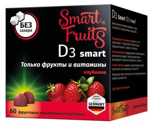 D3 Smart (D3 Смарт) — Биологически активная добавка к пище. Не является лекарственным средством.Только фрукты и витаминыНе содержит искусственных красителей, вкусовых добавок и ГМОПроизведено в Германии в соответствии с международным стандартом качества фармацевтического производства GMP и сертифицировано по стандарту Евразийского соответствия (Eurasion Conformity).Содержание в 1 пастилкеВитамин D3 (холекальциферол) 400 МЕОдна пастилка содержит: углеводы — 1,8 г, энергетическая ценность — 7 ккал/29 кДж.Витамин D3 способствует: укреплению иммунной системы снижению риска развития простудных заболеваний лучшему усвоению кальция укреплению костей и зубов снижению риска развития остеопорозаподдержанию функционального состояния органов сердечно-сосудистой системы нервной системы, включая психо-эмоциональную сферу и когнитивные функции:настроение, память, внимание, работоспособность, общий тонус организма поддержание репродуктивной функции организма