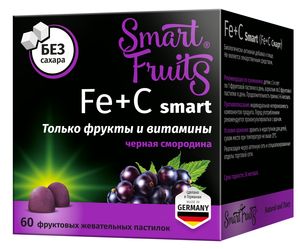 Бренд Smart Fruits — Компания Pharmamed представляет новую линию витаминных продуктов в виде жевательных пастилок на основе фруктов без сахара и сахарозаменителей под брендом Smart Fruits, разработанную совместно с компанией Paradise Fruits Solutions GmbH&Co (Германия).Среди витаминных БАД эта линия отличается своей инновационной формой, а именно 100%-ной фруктовой основой, это новый вид жевательных мармеладных витаминов, предназначенных для взрослых и детей с 3-х лет.Smart Fruits Fe+C Смарт — Биологически активная добавка (БАД) к пище — дополнительный источник витамина С и железа со вкусом черной смородины.Возраст: для детей старше 3-х лет и взрослых.Содержание биологически активных компонентов в 1 пастилке:Витамин С 25 мгЖелезо 7,5 мгОдна пастилка содержит: углеводы – 1,7 г, энергетическая ценность – 7 ккал/29 кДж.Инновационная технология производства позволяет получить продукт только из фруктов и нутриентов (витаминов, минералов, лекарственных растений).Вместе с тем витамины Smart Fruits обладают прекрасным, истинно натуральным вкусом делая ежедневный прием витаминов или минералов приятным и максимально полезным.Дозировки витаминов и минералов в продуктах Smart Fruits оптимально подобраны для каждодневного приема как взрослым, так и детям.Smart Fruits идеально подходят тем, кто ценит здоровый образ жизни, избегает продукты, содержащие неполезные добавки и избыточное содержание сахара.Превратите приём витаминов в 100% полезное удовольствие!Специальные особенности: без использования сахара, сахарозаменителей, искусственных добавок (красителей, ароматизаторов, консервантов) и ГМО.