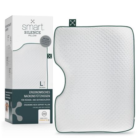 Подушка smart® SILENCE поддерживает оптимальное положение головы благодаря специальной S-образной форме, которая позволяет легче дышать во время сна. Благодаря высококачественной пене с эффектом памяти (CosyPur® от BASF) подушка обеспечивает идеальную поддержку шейно-воротниковой зоны и стабилизирует шейный отдел позвоночника в ночное время. Эффективная терморегуляция через встроенные воздушные каналы и высокая устойчивость к клещам и микробам делают подушку smart® SILENCE идеальной для аллергиков. Наслаждайтесь каждой ночью отдыхом без стресса и дискомфорта благодаря подушке smart® SILENCE. Обеспечьте себе и своему телу заслуженный отдых и проснитесь бодрыми и полными энергии каждое утро. Вязкоупругая пена с эффектом памяти Высококачественная поролоновая сердцевина (CosyPur® BASF) обеспечивает идеальную поддержку сзади и сбоку, оптимально адаптируется к индивидуальному давлению в положении лежа и обеспечивает всесторонний спокойный сон в различных положениях для сна. Идеально подходит для аллергиков Подушка не вызывает аллергии, обладает высокой устойчивостью к клещам и микробам и не содержит загрязняющих веществ или неприятных запахов. Эффективный контроль температуры Высококачественная поролоновая сердцевина и встроенные воздушные каналы обеспечивают оптимальную циркуляцию воздуха и эффективное регулирование температуры. Мягкая и гигиеничная поверхность Мягкая наволочка, на которой приятно лежать. Снимается и стирается при температуре 40 °C. Размер, габариты и вес Размер подушки: L |54x 40 x (9-12) см |1.1 кг. Особенности продукта: Размер: Большой Твердость: Средне-мягкая Тип сна: положение на спине и на боку Ширина плеч: средняя ширина Подушка smart® SILENCE представляет собой инновационное решение для комфортного и здорового сна. Выбирайте подушку smart® SILENCE и позвольте себе настоящий отдых каждую ночь!
