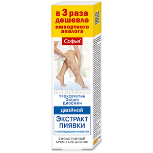 Софья Двойной экстракт пиявки с троксерутином, эсцином и кверцетином — натуральное эффективное средство, которому доверяют миллионы женщин во всем мире.Крем Софья обеспечивает комплексное воздействие и оказывает действенную помощь в поддержании красоты и здоровья ног, нормализует микроциркуляцию и лим-фоотток, снижает ломкость капилляров и риск возникновения трофических изменений кожи, улучшает эстетический вид ног.Экстракт медицинской пиявки (пия-вит) — по праву считается одним из лучших средств при лечении варикозной болезни ног.Он содержит около 100 биологически активных веществ, которые оказывают мощное положительное воздействие на кровеносные сосуды. Ферменты медицинской пиявки способствуют улучшению состава и уменьшению свертываемости крови (являются антикоагулянтами прямого быстрого действия), укреплению и вос-станавлению внутренней поверхности проблемных вен.Рецептура и технология производства крема разработана группой ученых под руководством доктора биологических наук, профессора, лауреата Государственной премии Б.Н. Орлова. Эффективность крема подтверждена обширной многолетней практикой применения в России и за рубежом.