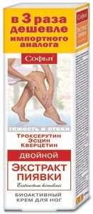 Софья Двойной экстракт пиявки с троксерутином, эсцином и кверцетином — натуральное эффективное средство, которому доверяют миллионы женщин во всем мире.Крем Софья обеспечивает комплексное воздействие и оказывает действенную помощь в поддержании красоты и здоровья ног, нормализует микроциркуляцию и лим-фоотток, снижает ломкость капилляров и риск возникновения трофических изменений кожи, улучшает эстетический вид ног.Экстракт медицинской пиявки (пия-вит) — по праву считается одним из лучших средств при лечении варикозной болезни ног.Он содержит около 100 биологически активных веществ, которые оказывают мощное положительное воздействие на кровеносные сосуды. Ферменты медицинской пиявки способствуют улучшению состава и уменьшению свертываемости крови (являются антикоагулянтами прямого быстрого действия), укреплению и вос-станавлению внутренней поверхности проблемных вен.Рецептура и технология производства крема разработана группой ученых под руководством доктора биологических наук, профессора, лауреата Государственной премии Б.Н. Орлова. Эффективность крема подтверждена обширной многолетней практикой применения в России и за рубежом.
