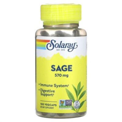 Дополнительные факты Размер порции: 2 VegCaps Обслуживание в контейнере: 50 Количество на порцию %Дневная стоимость Органический мудрец (Salvia officinalis) (лист) 570 мг * *Суточная доза не определена. Пищевая добавкаШалфей (Salvia officinalis)285 мг в 1 капсулеЦельный листЭффективность подтверждена результатами лабораторных исследованийЛистья шалфея от Solaray® на 100% вегетарианские, не содержат вспомогательных веществ, наполнителей или дополнительных ингредиентов.