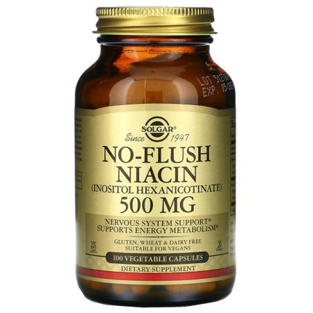 Solgar, ниацин, не вызывающий покраснений, 500 мг, 100 вегетарианских капсул