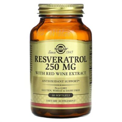 Дополнительные факты Размер порции: 1 Softgel Количество на порцию % Дневная стоимость транс-ресвератрол (от 500 мг [Polygonum cuspidatum] [корень]) 250 мг ** Экстракт красного вина (Vitis vinifera) (виноградная кожа) 10 мг ** **Суточная доза не определена С 1947 года С экстрактом красного вина Защитные антиоксиданты Без глютена, пшеницы и молочных продуктов Пищевая добавкаРесвератрол — это натуральный полифенол, который содержится в красном вине, арахисе и некоторых растениях, в том числе в траве Polygonum cuspidatum. Это небольшая молекула, относящаяся к категории стильбенлов. Полифенолы, такие как ресвератрол, обладают мощными антиоксидантными свойствами, помогающими бороться в организме со свободными радикалами, повреждающими клетки и вызывающими оксидативный стресс. В свою очередь, данный стресс может способствовать преждевременному старению клеток. Каждая мягкая желатиновая капсула содержит больше ресвератрола, чем обычная бутылка красного вина.