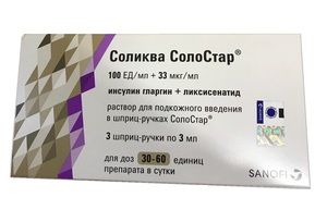 Показания к применениюСахарный диабет типа 2 — в комбинации с метформином в качестве дополнения к диетотерапии и повышенной физической нагрузке с целью улучшения гликемического контроля при неэффективности монотерапии метформином или комбинации метформина с другим пероральным гипогликемическим препаратом, или монотерапии базальным инсулином (для взрослых пациентов).Применение при беременности и кормлении грудьюОтсутствуют данные контролируемых клинических исследований по применению в период беременности препарата Соликва СолоСтар®, инсулина гларгин или ликсисенатида. В исследованиях на животных была продемонстрирована репродуктивная токсичность ликсисенатида, отсутствие эмбриотоксичности и тератогенности инсулина гларгин. Потенциальный риск для человека неизвестен. Препарат Соликва СолоСтар® противопоказан при беременности (из-за содержания в составе препарата ликсисенатида). При планировании беременности или ее наступлении лечение препаратом Соликва СолоСтар® следует прекратить. Нет данных о проникновении в грудное молоко человека инсулина гларгин или ликсисенатида. Применение препарата Соликва СолоСтар® в период грудного вскармливания противопоказано.Противопоказаниягиперчувствительность к ликсисенатиду, инсулину гларгин или любому из вспомогательных веществ, входящих в состав препарата, сахарный диабет типа 1, диабетический кетоацидоз, тяжелые заболевания ЖКТ, включая гастропарез, почечная недостаточность тяжелой степени (Cl креатинина менее 30 мл/мин), беременность, период грудного вскармливания, возраст до 18 лет (в связи с отстутствием данных по эффективности и безопасности применения в данной возрастной группе).Составинсулин гларгин 3.6378 мг (100 ЕД) ликсисенатид 33 мкг Вспомогательные вещества: глицерол (85%), метионин (L-метионин), метакрезол (м-крезол), цинка хлорид, хлористоводородная кислота, натрия гидроксид, вода д/и.
