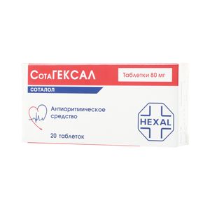 Показания к применениюСуправентрикулярная тахиаритмия: узловая тахикардия, тахикардия при WPW-синдроме, пароксизмальная мерцательная аритмия; желудочковая тахикардия, желудочковая экстрасистолия.Применение при беременности и кормлении грудьюПрием Сотагексала при беременности, особенно, в первые 3 месяца, возможен только по жизненноважным показаниям и при тщательном соотношении всех факторов риска.В случае проведения терапии при беременности, прием препарата следует отменить за 48-72 ч до предполагаемого срока родов из-за возможности развития брадикардии, артериальной гипотензии, гипокалиемии и угнетения дыхания у новорожденных.Соталол проникает в грудное молоко и достигает там эффективных концентраций. При необходимости назначения препарата в период кормления грудью, грудное вскармливание необходимо прекратить.ПротивопоказанияГиперчувствительность (в т.ч. к сульфаниламидам), хроническая сердечная недостаточность IIб-III стадии, шок, AV блокада II-III степени, синоатриальная блокада, синдром слабости синусного узла, брадикардия, удлинение интервала QT, гипокалиемия, гипотензия, тяжелые расстройства периферического кровообращения, обструктивные заболевания дыхательных путей (включая бронхиальную астму), метаболический ацидоз, отек гортани, миастения, тяжелый аллергический ринит.Побочное действиеСо стороны нервной системы и органов чувств: головокружение, головная боль, ощущение усталости, нарушение сна, спутанность сознания, парестезия, депрессия. Воспаление роговицы и конъюнктивы (следует учитывать при ношении контактных линз), ухудшение зрения (крайне редко), уменьшение слезоотделения.Со стороны сердечно-сосудистой системы и крови (кроветворение, гемостаз): сердечная недостаточность, брадикардия, AV блокада, стенокардия (в редких случаях), гипотензия.Со стороны респираторной системы: бронхоспазм.Со стороны органов ЖКТ: тошнота, диарея, запор, сухость во рту.Со стороны обмена веществ: гипогликемия (чаще у больных сахарным диабетом или при строгом соблюдении диеты).Со стороны мочеполовой системы: снижение потенции.Со стороны опорно-двигательного аппарата: чувство похолодания в конечностях, мышечная слабость или судороги.Со стороны кожных покровов: кожная сыпь, зуд (редко); покраснение, псориазоформный дерматоз, алопеция.СоставДействующее вещество: Соталола гидрохлоридКонцентрация действующего вещества (мг): 80