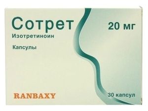 Показания к применениюДля приема внутрь: тяжелые формы узелково-кистозных акне, особенно с локализацией на туловище. Для ректального применения: тяжелые рецидивирующие формы угрей, сыпи с сопутствующим себорейным процессом. Для наружного применения: папуло-пустулезные угри, себорея, розовые угри, периоральный дерматит.Применение при беременности и кормлении грудьюИзотретиноин оказывает выраженное тератогенное и эмбриотоксическое действие. Противопоказан при установленной и планируемой беременности. Противопоказан в период лактации.ПротивопоказанияБеременность, установленная и планируемая, лактация, повышенная чувствительность к изотретиноину, одновременное применение антибиотиков группы тетрациклина. Для приема внутрь: тяжелые нарушения функции печени и/или почек, гипервитаминоз А, значительно повышенный уровень липидов в плазме крови, новообразования. Для ректального применения — заболевания прямой кишки.Побочное действиеДерматологические реакции: сухость слизистых оболочек, кожная сыпь, дерматит, зуд, хейлит, эритема (особенно на лице), потливость, ладонно-подошвенное шелушение, паронихии, дистрофия ногтей, усиленное разрастание грануляционной ткани в пораженной области; редко — истончение волос, васкулит, фоточувствительность. Со стороны органов чувств: конъюнктивит, светобоязнь, снижение ночного зрения, помутнение роговицы, ослабление слуха. Со стороны ЦНС и периферической нервной системы: головная боль; редко — депрессия, судорожные припадки, склонность к суициду; в единичных случаях — внутричерепная гипертензия. Со стороны пищеварительной системы: тошнота; редко — колит, кровотечения из ЖКТ, транзиторное повышение активности печеночных трансаминаз; в единичных случаях — гепатит. Со стороны системы кроветворения: анемия, нейтропения, изменение количества тромбоцитов, повышение СОЭ. Со стороны обмена веществ: повышение концентрации ТГ, глюкозы. Со стороны костно-мышечной системы: боли в мышцах и суставах; редко — гиперостозы. Прочие: носовое кровотечение. При ректальном и наружном применении: на 1-2 неделе лечения возможно появление новых высыпаний, зуда, отечности и покраснения кожи.СоставКапсулы 1 капс. изотретиноин 20 мг.Взаимодействие с другими препаратамиДействие изотретиноина ослабляется при одновременном применении прогестерона в микродозах. При одновременном применении изотретиноина и витамина А возможно усиление токсических эффектов. При одновременном применении изотретиноина и антибиотиков группы аминогликозидов существует риск развития внутричерепной гипертензии.