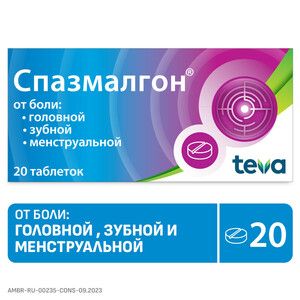Показания к применениюБолевой синдром умеренной или слабой выраженности: головная зубная боль мигрень невралгия миалгия артралгия альгодисменорея боль при травмах и ожогах.Препарат предназначен для уменьшения симптомов на момент применения и на прогрессирование заболевания не влияет. В случае необходимости пожалуйста проконсультируйтесь с врачом перед применением лекарственного препарата.Применение при беременности и кормлении грудьюПрименение препарата во время беременности и в период грудного вскармливания противопоказано.ПротивопоказанияГиперчувствительность к компонентам препарата а также к производным пиразолона угнетение костномозгового кроветворения (например вследствие лечения цитостатиками) или заболевания кроветворной системы (агранулоцитоз лейкопения апластическая анемия) выраженная печеночная и/или почечная недостаточность дефицит глюкозо6фосфатдегидрогеназы тахиаритмии тяжелая стенокардия декомпенсированная хроническая сердечная недостаточность закрытоугольная глаукома гиперплазия предстательной железы (с клиническими проявлениями) кишечная непроходимость мегалокон коллапс беременность период грудного вскармливания детский возраст до 8 лет атония желчного и мочевого пузыря непереносимость лактозы дефицит лактазы глюкозогалактозная мальабсорбция аллергия на пшеницу.Состав1 таблетка содержит: действующие вещества: метамизол натрия – 500 мг питофенона гидрохлорид – 5 0 мг фенпивериния бромид – 0 1 мг вспомогательные вещества: лактозы моногидрат 10 мг пшеничный крахмал 85 9 мг тальк (магния гидросиликат) 6 мг магния стеарат 4 мг желатин 4 мг натрия гидрокарбонат 5 мг.
