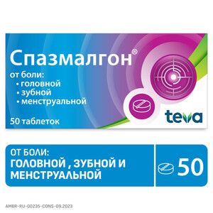 Показания к применению Болевой синдром умеренной или слабой выраженности головная, зубная боль, мигрень невралгия, миалгия, артралгия, альгодисменорея боль при травмах и ожогах. Препарат предназначен для уменьшения симптомов на момент применения и на прогрессирование заболевания не влияет. В случае необходимости пожалуйста проконсультируйтесь с врачом перед применением лекарственного препарата.Применение при беременности и кормлении грудьюПрименение препарата во время беременности и в период грудного вскармливания противопоказано.Противопоказания Гиперчувствительность к компонентам препарата, а также к производным пиразолона угнетение костномозгового кроветворения (например вследствие лечения цитостатиками) или заболевания кроветворной системы (агранулоцитоз, лейкопения, апластическая анемия) выраженная печеночная и/или почечная недостаточность дефицит глюкозо 6 фосфатдегидрогеназы тахиаритмии тяжелая стенокардия декомпенсированная хроническая сердечная недостаточность закрытоугольная глаукома гиперплазия предстательной железы (с клиническими проявлениями) кишечная непроходимость мегалокон коллапс беременность период грудного вскармливания детский возраст до 8 лет атония желчного и мочевого пузыря непереносимость лактозы дефицит лактазы глюкозогалактозная мальабсорбция аллергия на пшеницу Состав1 таблетка содержит: действующие вещества: метамизол натрия – 500 мг, питофенона гидрохлорид – 50 мг, фенпивериния бромид – 01 мг вспомогательные вещества: лактозы моногидрат 10 мг, пшеничный крахмал 85 9 мг, тальк (магния гидросиликат) 6 мг, магния стеарат 4 мг, желатин 4 мг, натрия гидрокарбонат 5 мг.