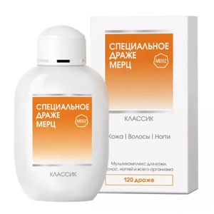БАД. Не является лекарственным средствомКрасота женщины рождается изнутри, наполняя ее взгляд и внешний вид естественным сиянием.Для правильного поддержания красоты изнутри необходим исключительный научный подход и средства, разработанные с учетом женских потребностей.Специальное Драже Мерц Классик – научно-разработанный витаминно-минеральный комплекс, который помогает раскрыть истинную красоту кожи, волос и ногтей изнутри.Специальное Драже Мерц Классик содержит оптимальную комбинацию витаминов, микроэлементов, которые насыщают организм веществами для роста здоровых клеток кожи, волос и ногтей. Компоненты Специального Драже Мерц Классик подобраны в такой пропорции, чтобы поддерживать естественные биологические процессы необходимыми питательными веществами.2 Драже в день обеспечат всестороннюю заботу о коже, волосах и ногтях.Активные компонентыТокоферол (витамин Е) участвует в процессах тканевого дыхания, обладает антиоксидантным действием.Аскорбиновая кислота (витамин С) — природный антиоксидант, необходим для синтеза коллагена — основного строительного белка кожи, который отвечает за упругость и эластичность кожи, полноценную работу иммунной системы, всасывание железа.Тиамин (витамин В1) играет ведущую роль в углеводном обмене, необходим для восстановления естественного блеска и придания гладкости волосам.Рибофлавин (витамин В2) — важнейший катализатор процессов клеточного дыхания, способствует активации кровообращения и росту волос.Пантотеновая кислота (витамин В5) усиливает водный обмен клеток кожи.Пиридоксин (витамин В6) принимает участие в белковом обмене, способствует росту и укреплению волос.Цианокобаламин (витамин В12) необходим для нормального кроветворения, способствует росту волос.Никотинамид (витамин В3) участвует в процессах тканевого дыхания, жирового и углеводного обмена, улучшает микроциркуляцию в клетках кожи.Железо участвует в эритропоэзе, необходимо для укрепления волос и ногтей.Биотин (витамин Н) необходим для роста волос и ногтей, является источником серы, которая принимает участие в синтезе коллагена.Цинк стимулирует обменные процессы в коже для повышения её плотности и эластичности.Фолиевая кислота (витамин В9) необходима для создания и поддержания в здоровом состоянии новых клеток кожи.