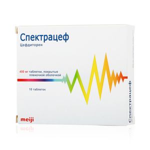 Показания к применениюЛечение инфекций, вызванных чувствительными к цефдиторену микроорганизмами: — инфекции верхних дыхательных путей: острый тонзиллофарингит, острый гайморит . — инфекции нижних дыхательный путей: обострение хронического бронхита, внебольничная пневмония . — неосложненные инфекции кожи и подкожной жировой клетчатки: флегмона, инфицированные раны кожи, абсцесс, фолликулит, импетиго и фурункулез.Применение при беременности и кормлении грудьюБеременность Клинические данные о применении цефдиторена пивоксила у беременных женщин не получены. И хотя исследования у животных не показали эмбриотоксичного или тератогенного эффектов препарата, Спектрацеф не следует применять во время беременности за исключением тех случаев, когда ожидаемая польза для матери превышает потенциальный риск для плода. Период лактации Данных о проникновении цефдиторена в грудное молоко недостаточно. Поэтому при применении препарата Спектрацеф кормление грудью следует прекратить.Противопоказания— повышенная чувствительность к цефдиторену, другим цефалоспоринам или любому другому компоненту препарата. — тяжелые аллергические реакции на пенициллины и другие бета-лактамные антибактериальные препараты . — печеночная недостаточность класса С по Чайлд-Пью . — пациентам, находящимся на гемодиализе . — реакции гиперчувствительности к белку казеину в анамнезе . — первичная недостаточность карнитина . — детский возраст до 12 лет . — одновременное применение цефдиторена пивоксила и блокаторов гистаминовых Н2-рецепторов. С осторожностью: пациентам с повышенной чувствительностью к другим бета-лактамным антибиотикам из-за возможности развития перекрестных аллергических реакций . одновременное применение с аминогликозидами и диуретиками (фуросемид) . пациентам с патологией ЖКТ (в т.ч. колит в анамнезе).СоставЦефдиторен 400 мг (в форме цефдиторена пивоксила) Вспомогательные вещества: маннитол сколько нужно (приблизительно 70 мг), натрия казеинат 200 мг, кроскармеллоза натрия 300 мг, натрия триполифосфат 8 мг, магния стеарат 10 мг, Опадрай белый 55 мг (гипромеллоза 34.4 мг, титана диоксид 17.2 мг, макрогол-400 3.4 мг), воск карнаубский 0.01 мг, чернила Опакод синий (шеллак IN IMS 74 OP 50.41 %, бутанол 24.35 %, Лак алюминиевый на основе красителя бриллиантового голубого FCF 11.25 %, титана диоксид 4.49 %, пропиленгликоль 2.91 %, изопропанол 4.65 %, аммиака раствор концентрированный 1.94 %).