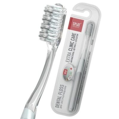 Зубная щетка Clinic Care с двумя видами щетины разной структуры и высоты – это инновация SPLAT® для глубокой чистки зубов по методу Басса. Эргономичную прорезиненную ручку Clinic Care удобно держать под углом 45 градусов к деснам, контролируя движения и силу давления на зубы. Двухуровневая спиралевидная щетина с ионами серебра на 20 % эффективнее очищает налет, чем обычная гладкая. Утонченные витые щетинки центральных рядов создают мягкий плотный контакт с поверхностью зуба, не травмируя эмаль и десны при чистке в технике Басса. Щетинки боковых поверхностей формируют ряд для очищения межзубных промежутков. Зубная щетка Clinic Care от SPLAT® рекомендована Стоматологической ассоциацией России для ежедневного использования, а также до и после процедуры профгигиены.