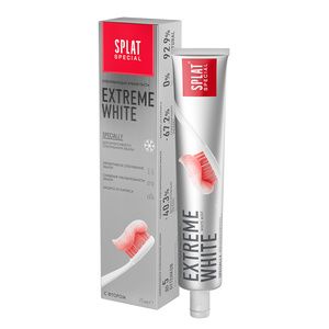 Внешний вид: Консистенция — пастообразая текстура Цвет — светло-розовыйСпециальные особенности:Содержание Монофторфосфата натрия — 0.06% (600 ppm).Зубная паста не содержит:SLS / SLES, PEG, парабены, триклозан, хлоргексидин, сахарин, синтетические красители.Все инновационные и уникальные зубные пасты серии Special были созданы в научной лаборатории SPLAT для активных и современных людей, которые не боятся экспериментировать, живут ярко и заботятся о своем здоровье.Эмоциональная серия уникальных продуктов, каждый из которых создан с учетом идей и пожеланий наших покупателей. Зубные пасты этой серии обладают богатым составом насыщенным эксклюзивными компонентами.Зубная паста Splat Special Extreme White — для интенсивного отбеливания зубной эмали.Основные компоненты и свойства:Инновационная отбеливающая зубная паста Extreme White содержит микрогранулы с пероксидом карбамида и уникальный отбеливающий комплекс Sp.White system®. Паста создана специально для мягкого отбеливания эмали в течение 4 недель ежедневного применения.Эффект интенсивного отбеливания достигается за счет содержания в пасте натуральных ферментов, расщепляющих мягкий зубной налет, полирующих частиц округлой формы и уникальных микрогранул с пероксидом карбамида, мягко и поэтапно отбеливающих на 2 тона за четыре недели использования.Фторид-ионы, входящие в состав пасты, надежно защищают от кариеса.Папаин сдерживает рост бактерий и способствует расщеплению мягкого зубного налета.Polydon® препятствует образованию зубного камня.Результат:Клинически доказано: отбеливающее эффект — на 2 тона*.*после 4 недель применения.