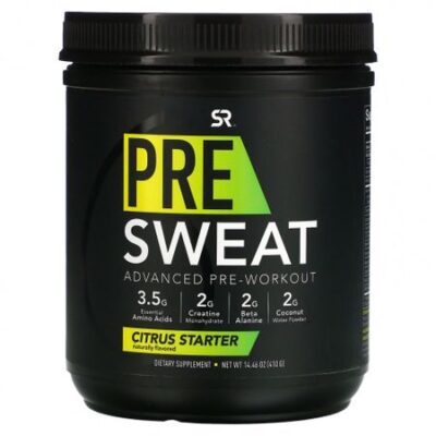 SR® Pre Sweat — это усовершенствованная предтренировочная формула, которая сочетает в себе обогащенные лейцином незаменимые аминокислоты (EAA превосходят BCAA), креатин из Германии, бета-аланин и другие ингредиенты, зарегистрированные торговыми марками, с превосходным вкусом, который, как мы знаем, вам понравится. На корте, на поле или в тренажерном зале — SR® Pre Sweat — идеальный способ получить максимальную пользу & подпитывайте вашу следующую тренировку!