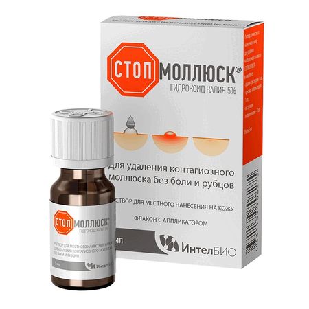 Первое доступное средство для удаления контагиозного моллюска без боли и рубцов • Можно применять с 2х лет • Обеспечивает эффективную деструкцию высыпаний контагиозного моллюска при использовании от 2 до 10 дней • Подходит для использования в домашних условиях • Заживление элементов протекает без образования рубцов даже при атопическом дерматите • Легко использовать при множественных высыпаниях • Минимум рецидивов • Форма аппликатора позволяет точечно наносить раствор на мелкие элементы высыпаний • Доступен по цене Механизм действия: 1. Точечная доставка КОН в центр папулы контагиозного моллюска (химическое воздействие). 2. Развитие локального воспаления. 3. Разрушение белковой и липидной оболочки вируса. 4. В ответ на воспаление стимулируется местный иммунный ответ, что приводит к естественному исчезновению контагиозного моллюска. Потенциальными потребителями медицинского изделия являются пациенты с кожными поражениями, вызванными контагиозным моллюском, в возрасте старше 2 лет. Технические характеристики: медицинское изделие представляет собой прозрачную бесцветную жидкость с характерным запахом. Показания к применению: раствор для удаления контагиозного моллюска СТОПМОЛЛЮСК предназначен для нанесения на поверхность кожных поражений, вызванных контагиозным моллюском. Противопоказания: запрещается использовать раствор в следующих случаях: — для детей в возрасте до 2-х лет; — на слизистых оболочках или на участках вокруг глаз; — при наличии аллергии на любой из компонентов раствора; — на участках кожи, пораженных контагиозным моллюском с признаками вторичного инфицирования и воспаления; — на обычных бородавках или иных кожных образованиях. При возникновении сомнений или вопросов обратитесь за консультацией к врачу. Предупреждения и меры предосторожности при использовании: при неправильном использовании данное медицинское изделие может вызывать раздражение здоровых тканей кожи. Раствор следует наносить исключительно на участок кожи, пораженный контагиозным моллюском. Не допускайте попадания раствора на здоровую кожу! Запрещено наносить раствор на слизистые оболочки или на участки вокруг глаз. Настоятельно рекомендуем кормящим матерям не наносить раствор на участки тела, которые могут соприкасаться с кожей младенца. Не рекомендуется использовать раствор пациентами, страдающими острой атопической экземой, а также лицам с дефектами иммунной системы. При попадании раствора на кожу вокруг контагиозного моллюска — промойте кожу водой. При попадании в глаза — промойте большим количеством воды и обратитесь к врачу. При попадании на пальцы не прикасайтесь к глазам или к слизистым оболочкам. Немедленно вымойте руки. Взаимодействие с другими средствами: чтобы избежать нежелательного взаимодействия с другими средствами обязательно информируйте врача или фармацевта о других применяемых средствах. Порядок работы с медицинским изделием: раствор предназначен для самостоятельного применения в домашних условиях, используется только наружно. При использовании раствора размещайте флакон на плоской поверхности, чтобы избежать пролива. При применении раствора СТОПМОЛЛЮСК нет необходимости в местной анестезии. Перед использованием раствора необходимо внимательно ознакомиться с инструкцией по п