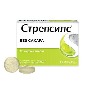 Показания к применению- симптоматическое лечение боли в ротовой полости, глотке, гортани при инфекционно-воспалительных заболеваниях (тонзиллит, фарингит, ларингит /в т.ч. профессионального характера — у преподавателей, дикторов, работников химической и угольной промышленности/);- охриплость;- воспалительные заболевания слизистой оболочки полости рта и десен (афтозный стоматит, гингивит, молочница).Применение при беременности и кормлении грудьюПрименение препарата при беременности и в период грудного вскармливания возможно только под контролем врача.Противопоказания- детский возраст до 5 лет;- повышенная чувствительность к компонентам препарата.С осторожностью следует применять препарат при бронхиальной астме, беременности и в период грудного вскармливания.Побочное действиеАллергические реакции: сыпь, чувство жжения или покалывания в горле, отек глотки и/или гортани.В случае появления необычных реакций пациенту следует проконсультироваться с врачом о целесообразности дальнейшего применения препарата.СоставОдна таблетка содержит действующие вещества:2,4-дихлорбензиловый спирт 1,2 мг, амилметакрезол 0,6 мг;Вспомогательные вещества:таблетки для рассасывания [лимонные]: винная кислота 26 мг, ароматизатор лимонный 74940-74 4,16 мг, краситель хинолиновый желтый (E 104) 0,01 мг, натрия сахаринат 2 мг, изомальтоза 1834,296 мг, сироп мальтитола 458,57 мг до получения таблетки массой 2,35 г.Взаимодействие с другими препаратамиКлинически значимого взаимодействия препарата Стрепсилс с другими лекарственными средствами не выявлено.Возможно одновременное применение препарата с другими местными противомикробными средствами.