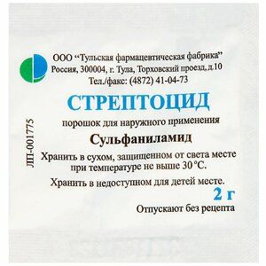 Показания к применениюГнойные раны, ожоги, пролежни, тофические язвы, диабетическая гангрена, рожистое воспаление, дерматиты, пиодермия и др.Противопоказанияповышенная чувствительность к сульфаниламидам.Противопоказан к применению в I и II триместрах беременности и в период лактацииПобочное действиекожные аллергические реакцииСоставсульфаниламид 2,0 гр