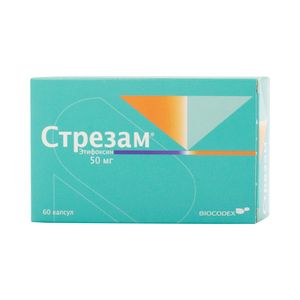 Показания к применениюЛечение психосоматических проявлений тревоги.Применение при беременности и кормлении грудьюПрименение препарата при беременности и в период грудного вскармливания не рекомендуется. При беременности, наступившей во время лечения препаратом Стрезам, пациентка должна проконсультироваться с врачом по поводу продолжения лечения.Противопоказания Повышенная чувствительность к компонентам препарата Шоковые состояния Миастения Тяжелые нарушения функции печени Тяжелые нарушения функции почек Из-за присутствия в составе препарата лактозы, препарат не следует применять при галактоземии, синдроме мальабсорбции глюкозы и галактозы, а также в случае лактазной недостаточности. Детский и подростковый возраст до 18 лет.Побочное действиеОпределение частоты нежелательных явлений (НЯ), отмечавшиеся при приеме данного препарата редко (≥1/10 000 и меньше 1/1000), очень редко (меньше 1/10 000) в порядке убывания частоты. Со стороны нервной системы редко — незначительная сонливость, появляющаяся в первые дни приема и обычно исчезающая самостоятельно в процессе лечения. Со стороны кожи и подкожной клетчатки редко — макуло-папулезные высыпания, многоформная эритема, зуд, отек лица. Аллергические реакции очень редко — крапивница, отек Квинке. Частота не установлена — анафилактический шок, синдром лекарственно-индуцированной гиперчувствительности с эозинофилией, синдром Стивенса-Джонсона, лейкоцитокластический васкулит. Со стороны печени и желчевыводящих путей частота не установлена — гепатит, цитолитический гепатит. Со стороны половых органов и молочной железы частота не установлена — метроррагия у женщин, принимающих пероральные контрацептивы. Со стороны пищеварительной системы частота не установлена — лимфоцитарный колит.Состав1 капсула содержит: Активное вещество: этифоксина гидрохлорид 50 мг. Вспомогательные вещества: лактозы моногидрат — 119 мг, тальк — 15 мг, целлюлоза микрокристаллическая — 10 мг, кремния диоксид коллоидный безводный — 3 мг, магния стеарат — 3 мг. Состав оболочки: титана диоксид, желатин, индигокармин. Взаимодействие с другими препаратамиСтрезам потенцирует действие препаратов, угнетающих ЦНС (в т.ч. Опиоидных анальгетиков, барбитуратов, снотворных препаратов, антигистаминных средств, нейролептиков). Стрезам усиливает воздействие этанола.
