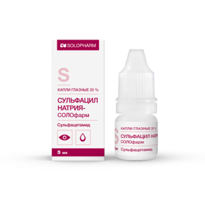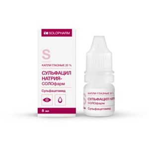 Глазные капли Сульфацил натрия Солофарм — антибактериальное средство для местного применения в офтальмологии, производное сульфаниламида. Обладает широким спектром противомикробного действия. Оказывает бактериостатическое действие. Механизм действия связан с конкурентным антагонизмом с ПАБК и конкурентным угнетением дигидроптероатсинтетазы, что приводит к нарушению синтеза тетрагидрофолиевой кислоты, необходимой для синтеза пуринов и пиримидинов.Сульфацетамид активен в отношении грамположительных и грамотрицательных бактерий (в т.ч. патогенных кокков, Escherichia coli), Chlamydia spp., Actinomyces spp.