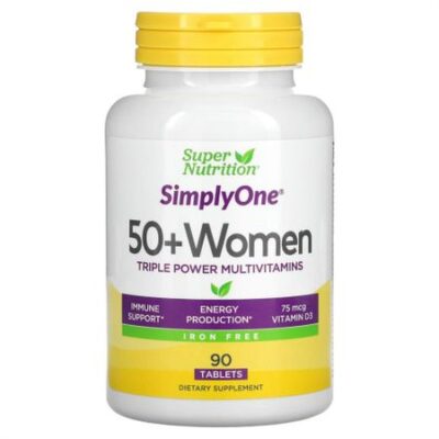 Мультивитаминная добавка тройного действия для женщин старше 50 лет SimplyOne без железа Super NutritionСодержит мощные витамины, минералы и растительные ингредиентыНе содержит железаПоддержка иммунной системы и выработки энергии*Не содержит глютена и ГМОНаучно разработанная пищевая добавка